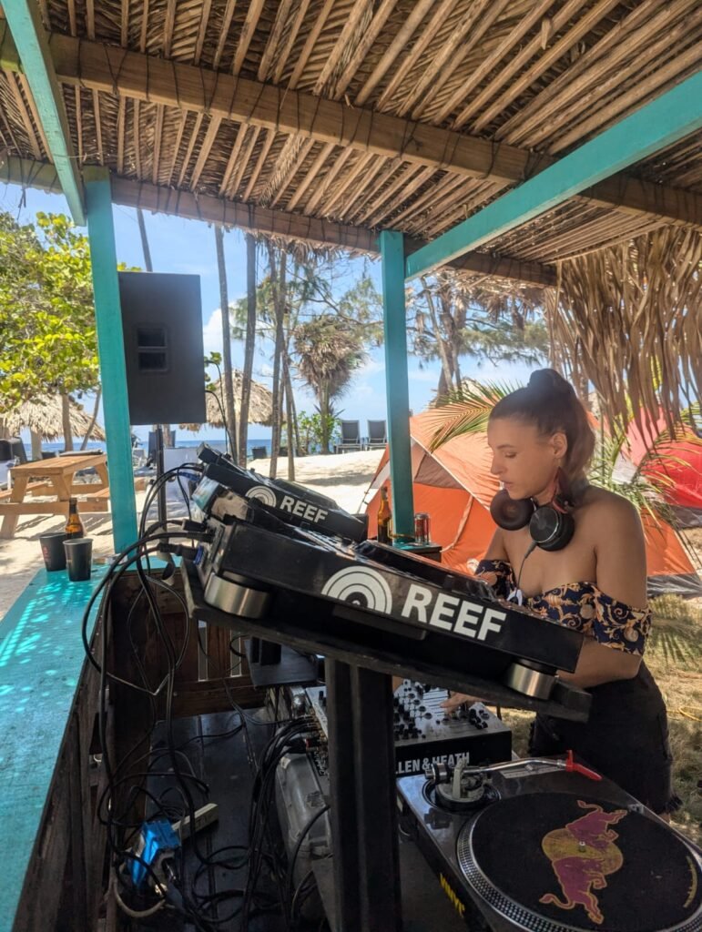 Todo comenzó de manera casual, creando playlists para sus amigos. Uno de ellos, Scuba Steve —DJ de profesión— la animó a dar el siguiente paso. En noviembre de 2023 decidió aprender, y apenas un mes después, su amigo Sam, dueño de Utila Brewing Company, le dio la oportunidad de abrir el Jungle Party.